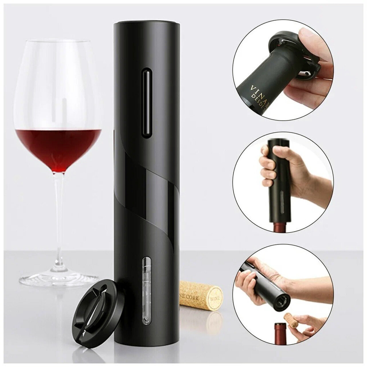 Интуитивно понятное управление всего одной кнопкой. После нажатия кнопки штопор войдет в пробку, затем нажать вверх, и бутылка откроется. Электрооткрывалка для вина представляет собой высококачественное изделие, изготовлена из крепких и износостойких материалов. Пробка для бутылки поддерживает степень вакуума на необходимом уровне, что гарантирует надежную сохранность потребительских качеств вина.